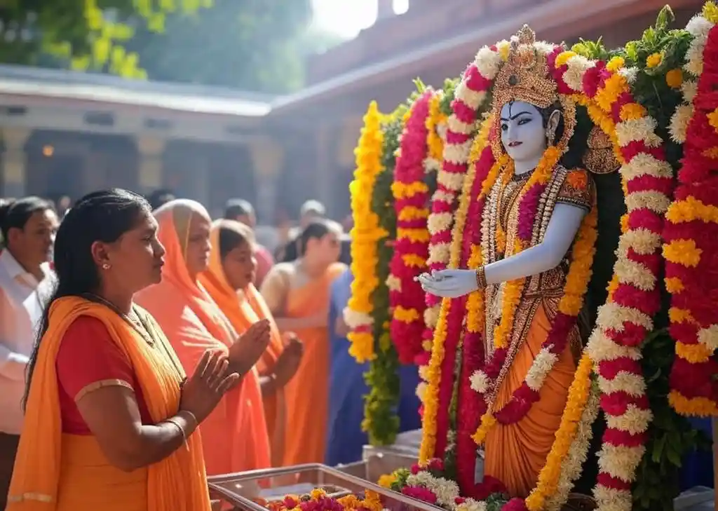 Devotees observe a fast (vrat) and perform puja dedicated to Lord Rama, often involving mantras like “Om Shri Ramaya Namah”.